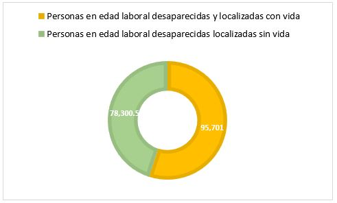 According to statistics from the National Registry of Unlocated Missing Persons (RNPDNO),11 the number of disappeared persons in the period from March 15, 1964 to December 13, 2021 was 234,914, of which 129,939 have been located alive, that is, approximately 55% Figure 1. According to the missing persons and those found alive, 56% correspond to the female sex, 44% to the male sex and less than 1% undetermined. Based on the ages of the Disappeared Persons, 174,001 range between 15 and 59 years of age, who will be considered for the purposes of this investigation as persons of working age. If to this total, the percentage of people that in global terms have been located alive, which is equivalent to 55%, is applied, then we will have approximately the following Figure 2: