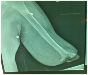 Mr M.E., 38 years old, right-handed, unemployed, known as a drug addict using cocaine by injection, on treatment but poorly monitored. In his background in addition to various infectious episodes, there is essentially this notion of confusion with dysphasia but investigations have not been pushed, was it a transient stroke? He consulted at the emergency for spontaneous loss of his forearm (Figure 1). The patient said it began few months ago when necrotic areas started to appear on his forearm. Each time he consulted a doctor, an antibiotic treatment was prescribed but no improvement was noticed. Worse, neurological disorders started to manifest on his hand with a sphacelus aspect which kept on increasing. For him, that was what motivated him to check it again. A topical antibiotic treatment was prescribed. Noted that the patient’s discourse was inconsistent and seem absurd. Letting things evolve, the eve of his emergency department visit, wanting to wash, his forearm broke away making surgical disarticulation at his elbow. On examination we were amazed by the calm of the patient who arrived with his forearm which looked like mummified in a bag. The spontaneous amputation was done at the elbow joint with exposure of the distal hummers (Figure 2). The x-ray examination did not show signs of osteitis (Figure 3). After assessment, the patient was taken to the operating room where we conducted further amputation stump with regularization (Figure 4).