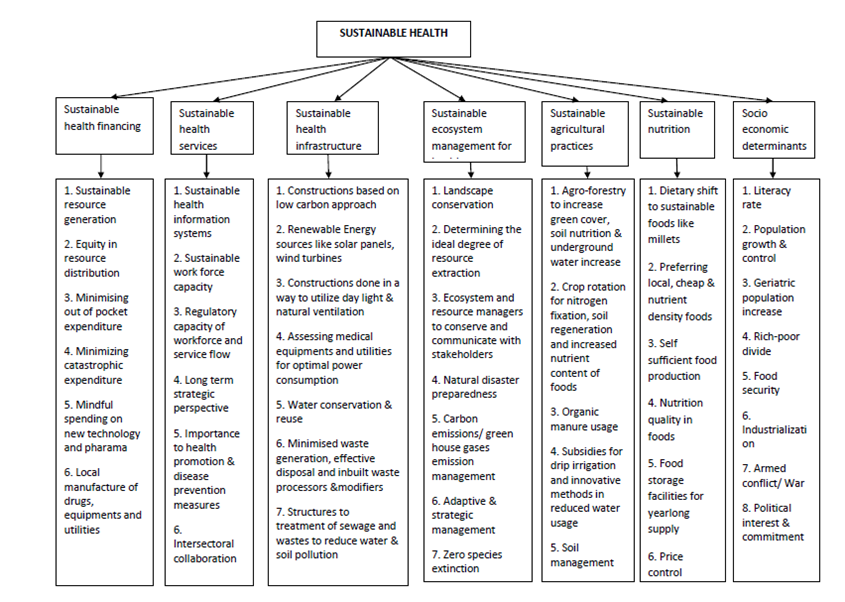 Sustainability means the ability to continue, maintain and support any process over time without any damage as a product of the process. Sustainable health is when the health of the population are maintained, restored, and improved along with minimizing damage to the surrounding environment, other living beings, and natural resources.1 Sustainable health is a center and prime factor for human sustainability and life around us also to a certain extent. Health in turn is a prime and foremost important determinant for a country's economy, development, and quality of life of its individuals.2 It is a balancing equation between health, money, and environment.3