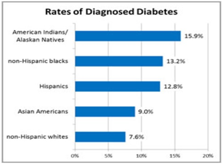 According to the American Diabetes Association, the prevalence of diabetes in 2012 was 29.1 million Americans or 9.3% of the population. Among the 29.1 million, 21 million were diagnosed and 8.1 million were never diagnosed.1 The prevalence in seniors, age 65 and older, was 11.8 million or 25.9% both who were diagnosed and undiagnosed.1 Each year, the incidence of diabetes in the U.S. is 1.4 million. It is estimated that by the year 2050, should current trends persists, one-third of American adult population will be diagnosed with diabetes.1 There is evidence to support the notion that racial and ethnic disparities exist among those with diabetes and Alzheimer’s disease.1 In Figure 1, statistics have shown that 15.9% of American Indians, 13.2% non-Hispanic blacks and 12.8% Hispanics are currently diagnosed with diabetes. In addition the reported numbers of infected individuals are decreased to 9.0% of Asian Americans and 7.6% in non-Hispanic white Americans. The high incidence of diabetes type II among these groups can be attributed to the following predisposing factors; 1) increased accessibility to high calorie refined foods, 2) obesity, and 3) a sedentary lifestyle.8