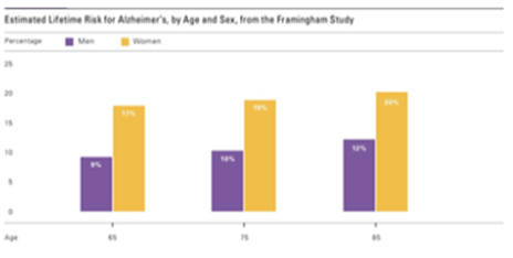 There is data to support that major risk factors for susceptibility to Alzheimer’s disease are an individual’s age and gender.14 In (Figure 4), The Framingham Study inferred that more women than men have the disease. This is because more women live longer than men. Men are more prone to cardiovascular problems compared to women of middle age.2-12 As for the men living longer than age 65, they usually have a lower risk for cardiovascular disease based on their health history and hence, a lower risk for dementia.2-13 Since having a higher level of education decreased the likelihood of developing AD, males had a lesser chance of developing AD. This is owing to the fact that men age 65 and older had a higher educational status than women born in the early1900s. 14Fewer women acquired higher education in that era and were unlikely to achieve a higher level on education.14 Based upon the study’s findings, this disparity in prevalence seem to suggest that higher education and brain stimulation decreases the risk of AD.