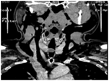 A 42-year-old male with a history of Diabetes mellitus type of 14 years of evolution, systemic arterial hypertension (ASH) of recent diagnosis that started 2 years ago, presenting dyspnea of medium effort, as well as dry cough and intermittent pharyngodynia. In December of 2013, a hemoptysis was added, so his hospitalization was decided and he was discharged on the third day. Bronchoscopy was performed by pulmonologist, finding a tumor between the 3rd and 4th tracheal ring, obstructing 80% of the lumen of which (Figure 1) a biopsy was taken, which was reported as cystic adenoid carcinoma with a cribiform and tubular pattern. They requested our assessment to perform a low tracheotomy we request assessment by performing a low tracheostomy. CT Computed tomography of the neck is requested, observing at the level of the first tracheal rings rounded lesion, attached to the wall which measures 13x13x1mm, being limited to the tracheal light occupying 85% of the same, without data of infiltration of adjacent tissues with important enhancement when applying contrast medium (Figure 2) (Figure 3). Evaluated by surgical oncology in March 2014 and May 2014 to perform neck exploration and resection of the 1st to 3rd tracheal ring with tracheal plasty, finding tumors from the 1st to the 3rd tracheal ring with free edges according to the transoperative examination, 4 days in the ICU with adequate evolution without need of ventilatory support, without presenting data of respiratory difficulty, with adequate evolution, it is discharged without the need of additional treatment. I do not consider it necessary to administer chemo-radiotherapy, the last tomographic control in November 2014 without evidence of tumoral activity, asymptomatic.