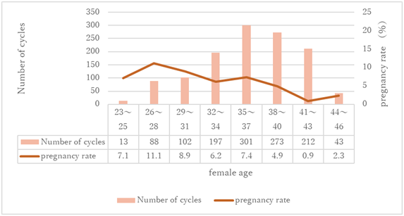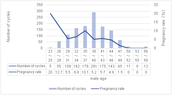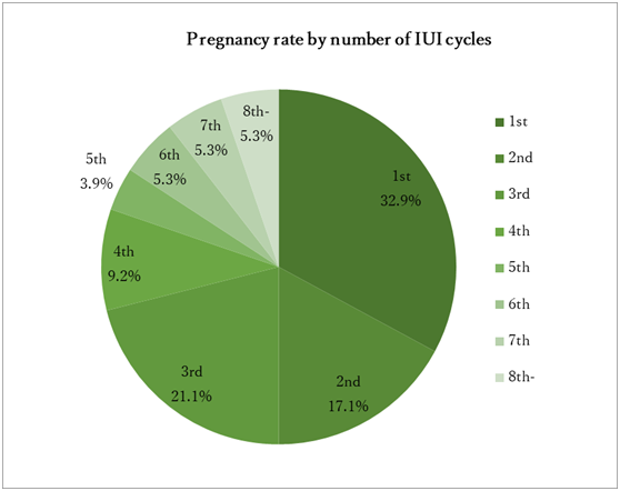 Intrauterine insemination (IUI) using the husband's semen, is a treatment for infertility due to mild male factors, sexual intercourse problems, and in cases of unexplained infertility where regular intercourse does not result in pregnancy after a certain time period. In recent years, the average age of marriage in Japan has risen, and the age at which couples who visit our hospital to have a baby is also rising. The couples who come for treatment want to be pregnant in the shortest time possible, and the therapist performing the IUI needs to, as far as possible, accurately predict when pregnancy will occur, to advise how long to continue the IUI, and at what point to step up to in vitro fertilization (IVF). There are several factors reported to affect pregnancy rates with IUI. For women, age, mature follicle count and endometrial thickness,1 and in men, sperm concentration and total motile sperm count1,2 are predictive of pregnancy. We perform IUIs for patients without bilateral tubal obstruction or severe male factor infertility, without any age restrictions. In this study, we summarized the outcomes of IUIs performed at our hospital over the past 3 years and examined whether age and semen findings could be predictive of pregnancy rates.