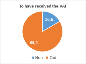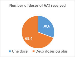 Tetanus vaccine (TT) was administered to 83.4% of participants. However, there was still a significant proportion (16.6%) of women not immunised against neonatal and maternal tetanus. In terms of the doses of vaccine received, the results show that 30.6% of women received a single dose of VAT. Thus, only 69.4% of the women surveyed had received at least two doses of TT as recommended for effective coverage against maternal and neonatal tetanus (Figure 7).