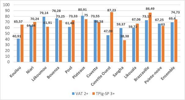 An examination of the coverage rates for VAT 2 (two doses or more) and Intermittent Preventive Treatment during Pregnancy with three doses of sulfadoxine-pyrimethamine (IPTp-SP 3) by department reveals a number of similarities. The low coverage rates for VAT 2+ are observed in the Kouilou and Cuvette-ouest departments, while the low coverage rates for IPTg-SP 3+ are observed in the Sangha and Lékoumou departments. The number of doses of SP administered varies from 1 to 6. In 6 of the 12 departments, it varies from 1 to 3: Kouilou, Lékoumou, Plateaux, Cuvette-Ouest, Sangha and Likouala. Figure 8 shows the distribution of SP doses administered, by department.