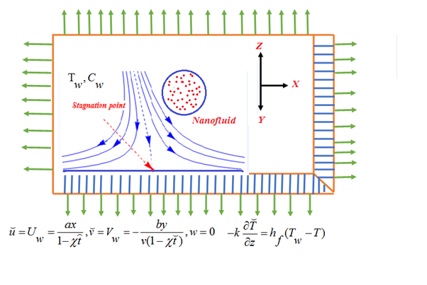 along XY-direction, where a, b and c are constant. The flow occupied the region Z > 0. Seen in Figure 1 the geometrical representation of current investigation. A non-uniform magnetic field