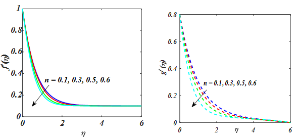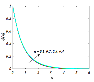 . From the Figure 2 dimensionless velocity and concentration was reduced for the increasing value of (n). Actually, higher value of n boosts to improved the pressure on the flow results reduction in velocity and concentration and increment in thickness of layer and solutal boundary layer. Figure 5–7 have revealed to view the unsteady parameter (