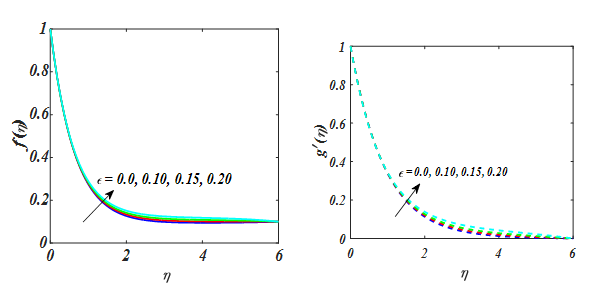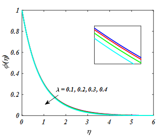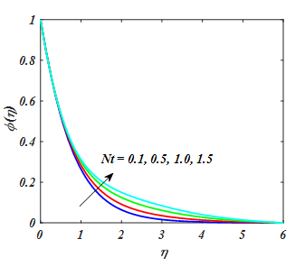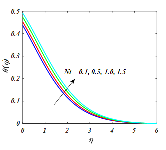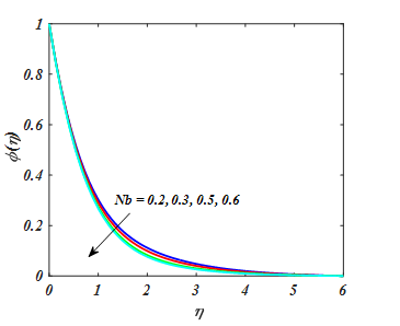 A significant of Nt and Nb for temperature and concentration of nanoparicle are explored in Figure 14–17. From Figures. the θ(η) and ϕ(η) distribution is increased for increasing value of Nt. From Figure 16,17 shown that the Nb boosts the temperature and reduced the concentration of nanoparticle. A fluid particle intensifies with augmentation in Nb and more heat is formed to amplify the thermal layer thickness. While enlarging value of Nb reduces nanoparticle concentration. Physically, boost in the magnitude of Nb result to enhance the rate of diffusions of nanoparticles in the base fluid motion in irregular direction. So, motion of nanoparticles escalates in convey of heat and decline in concentration.
