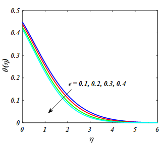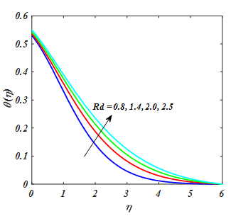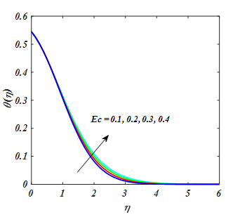 Figure 18 exhibits the effect of (Pr) on θ(η). Clearly from Figure 18 larger Pr fallout temperature profile whereas the fluid become more viscous. Consequently, fluid with a less viscosity obtained a leading temperature and greater viscosity produced the lesser temperature. So, by growing in Pr leads to thermal diffusivity which decline temperature of tangent hyperbolic fluid. The θ(η) for the variation of Rd has been exhibited in Figure 19. It describes that increase in temperature leading function of Rd. Physically, higher the radiation parameter Rd heat is produced in working fluid that is the reason temperature gradient accelerates. Temperature profile for diverse values of Ec has been indicated in Figure 20. Fluid temperature escalates for larger value of Ec. In this regard the increment in Eckert number Ec results increase in internal source of energy and that is the reason fluid temperature rise.