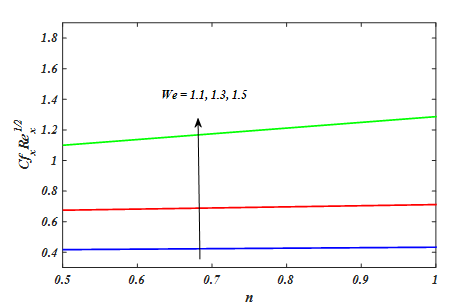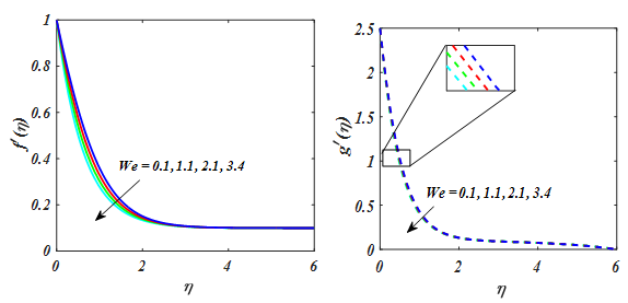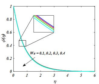 . Figure 8 larger the value of We upsurge in momentum layer and velocity. It is a fact that We is a thermal relation time to increase more flow of fluid. From Figure 9 is plotted to view that temperature of nanofluid is augmented for the greater value of We. Physically, an enhanced in thermal relaxation process result the increased in fluid temperature. From Figure 10 is sketch to clear that concentration of nanoparticles is intensified for increment value of We. Figure 11–13 shows the