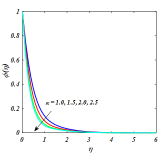 Figure 21,22 depicted the effect of Sc and k on nanofluid concentration. It is not able that an augment k and Sc has a trend to decline the nanofluid concentration.