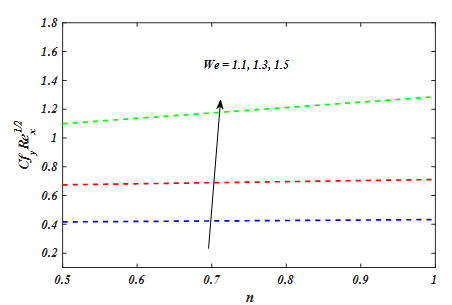 =0.8. Table 2 show the numerically result of various value of emerging parameter. Enlarging the value of We and n accelerates the skin friction. While it is noted that rate of Nusselt and Sherwood fall down by increasing value of Rd and k Table 3.