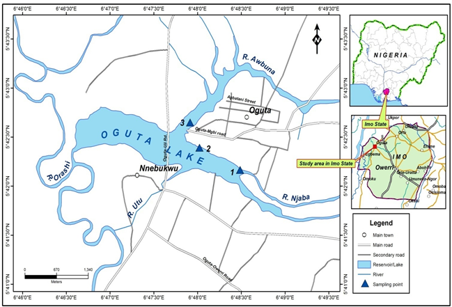 Oguta Lake is situated in Oguta local government Area of Imo State; it constitutes the largest natural lake in Imo State, South East Nigeria. It is located between latitude 5ᵒ42'24''N and longitude 6ᵒ47'33''E and has a maximum depth of 8m and a mean depth of 5.5 and water surface area that varies from1.8km2 in dry season to 2.5km2 at the peak of the rainy season. The length of the shoreline is approximately 10km.11 The region is located within the equatorial rain forest, with an average annual rainfall of 3,100mm. Oguta Lake increases in size during the rainy season when it receives overflow and floodwaters from its tributaries (Utu, Awbuna and Njaba River), although river Utu is seasonal, taking its source from river Orashi (an outlet of Oguta lake), and normally empties into Oguta during the high tide (Figure 1). Oguta Lake drains into Orashi, a main river on the east- bank flood plain of the Niger and which conveys river Niger’s flood waters directly into Niger delta.