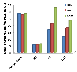 Figure 2 Temporal variations in mean water temperature, pH, Electrical conductivity and Dissolved CO2 in the Oguta Lake.