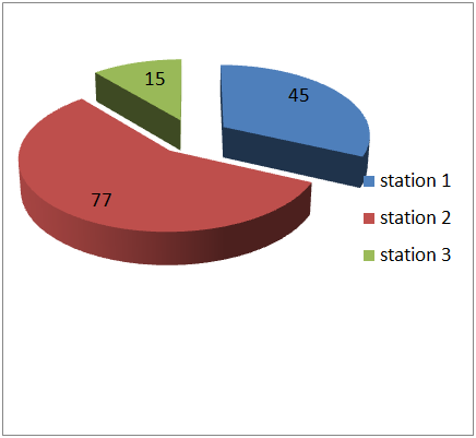 The results of the Macro-invertebrates diversity analysis are presented in Table 6 accordingly. Shannon-Weiner’s index (H) revealed Chironomus sp was observed to record higher diversity index (2.34) while Mayfly nymph was least evenly distributed (0.818). The spatial diversity indices for the Macro-invertebrates fauna recorded in the three sampling stations during the study period are presented in. Sampling station 2 recorded the highest diversity index (H=0.768) while station 1 recorded the least diversity index (H=0.399) . Sampling station 2 recorded the overall highest percentage abundance (77%), while station1 recorded the least abundance (15%). The general order of abundance of Macro- invertebrates across the sampling stations were 2>1>3 (Figure 8).