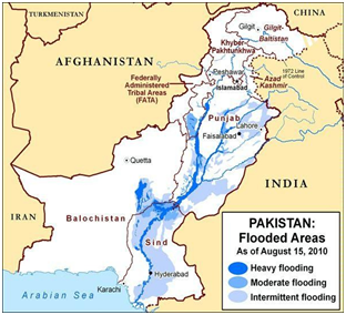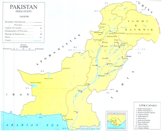 Figure 1 shows the neighborhood elevation of the flooded areas in Pakistan. The most significant reason of floods in Pakistan are the monsoon rains in which there is heavy rainfall which is intensified by the snow melt flow in river drainage. Land sliding also results in floods. These floods cause heavy losses including loss of human life and animals, structural damages including bridges, sewerage systems, roadways and canals, raising waterborne diseases and disintegration of farmland resulting in shortage of food. Nevertheless, in the annual report for the year 2010, FFC (Federal Flood Commission) described that highest damage is observed in the lower part of Indus River specially in Sindh where flow is at a peak in the neighboring areas.1 River Indus is one of the longest rivers of the world. It has seven (7) dams or barrages mainly and has a length of 1800 (miles). Its total discharged area is around 450000 (square miles) out of which 275000 (square miles) lies in semi-arid deserts of Pakistan while the rest comprises of mountains of Pakistan. The River Indus runs through the region of Ladakh which is in Jammu and Kashmir, Gilgit-Baltistan and flows through Pakistan in southerly direction along the whole length of Pakistan to converge into the Arabian Sea near the port city of Karachi in Sindh. Indus River is largely observed by its seven gauge stations which are Tarbela Dam, Chashma Barrage, Kalabagh or Jinnah Barrage, Taunsa Barrage, Guddu Barrage, Sukkur Barrage and Kotri Barrage as shown in Figure 2.