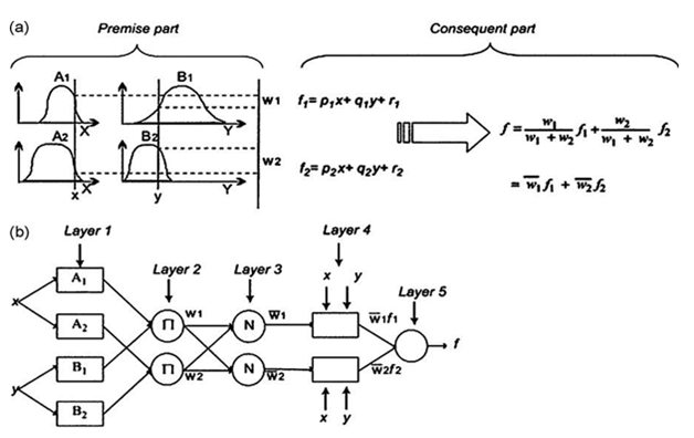 Here, for the input variables x & y the MFs are A1, A2 & B1, B2 respectively, and the parameters for the output function are p1, q1, r1 and p2, q2, r2. and Figure 4(A) explains fuzzy reasoning technique to obtain the output function i.e. f for this Sugeno model from the provided input variables [x, y]. The related equivalent architecture of ANFIS is described in Figure 4(B), where the same layer nodes have corresponding functions. The following are procedures of ANFIS functioning: