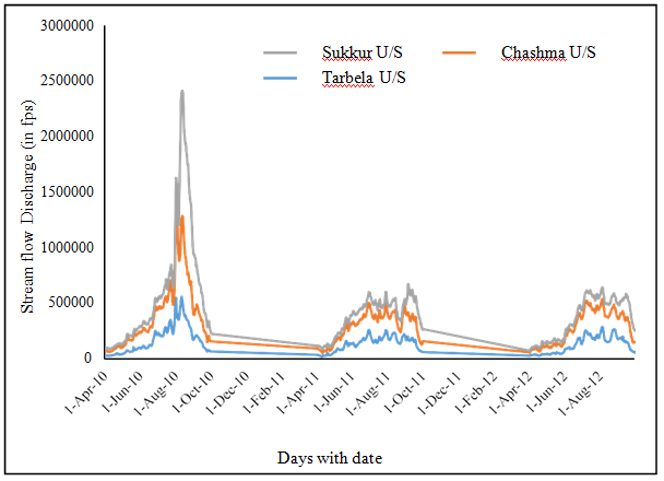 For the present study, we have collected the data from Federal Flood Commission (FFC), situated in Islamabad, which is comprised of eleven years recording at three gauge stations. Data investigation of three previously mentioned gauge stations reveals that the surveyed data is highly varied and disordered. Flow behavior of Tarbela Dam, Chashma and Sukkur Barrages, from 2010 to 2012, are displayed in Figure 5. Parameters which are interrelated to three foregoing stations are provided in Table 1. From the Table 1, it is clear that standard deviation and the difference between the maxima and minima are large, so that gauge station modeling will be complex. In this regard, for fuzzy network, we consider input data for ten years from year 2002 to year 2011 of the daily stream flow to check different models as training data. Moreover, different models were also tested using testing data for only 1 year i.e. 2012, the daily stream flows (6 peak months’data) for each gauge station. Entered the Input data into the neuro-fuzzy network and results are shown in Tables below.