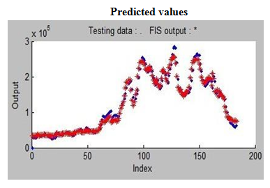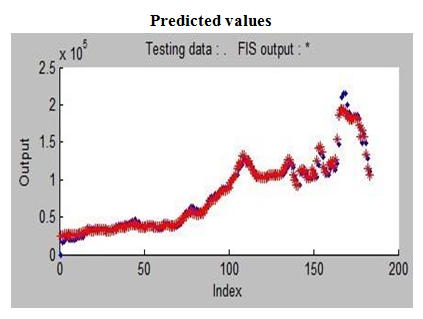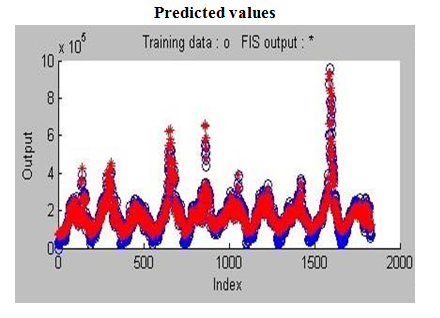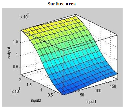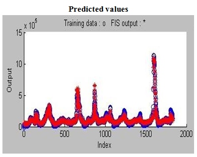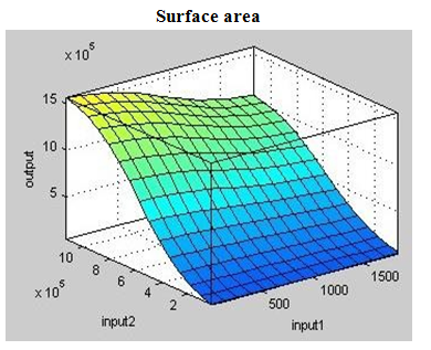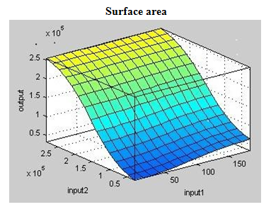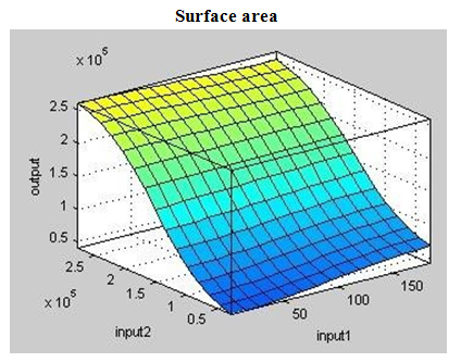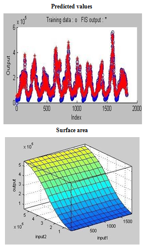 Results of Tarbela dam for daily stream flow prediction for the year 2012 and in years 2002-2011 are presented in Table 2A and 2B respectively for different inputs and different membership functions. Curves in Figure 6A, indicate the predicted values and surface area for Tarbela dam using observed data and applied neuro-fuzzy technique for the year 2012. In the graph above of predicted values in Figure 6A, the output data on y- axis means stream data values in fps and on x-axis index means no. of days i.e. 183 peak days for the year 2012 and also Figure 6B indicates the predicted values and surface area for the years 2002 to 2011. In the graph above of predicted values in Figure 6B, the output data on y- axis means stream data values in fps and on x-axis index means no. of days i.e. 1830 peak days for above mentioned years.
