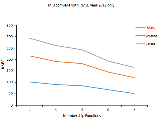Furthermore, we find that the results of the three stations indicate that the best results can be attained by the structure of neuro-fuzzy model and the best outcomes with minimum errors are for the year 2012, for Tarbela Dam using data inputs dt, dt – 1, dt – 2 and eight membership functions (MFs). Table 2A shows these results. From Table 3A, it can be seen that for Chashma barrage the structure with minimum error using data inputs dt, dt – 1, dt – 2 and eight membership functions (MFs) was obtained for the year 2012. But for Sukkur barrage where the flood risk is very high, Table 4b shows an enormous decrease or drop in the error i.e. 87.92 for large amount of data
