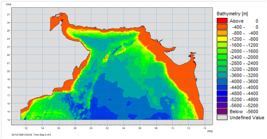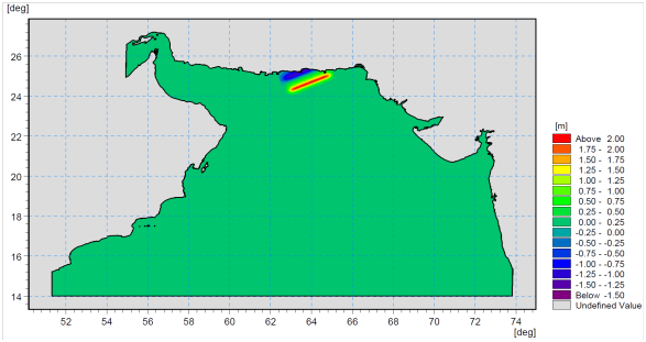 Royal HaskoningDHV has developed a Regional Tsunami Model for the Arabian Sea using the MIKE21/3 Flow Model FM software.9 The modelling system is based on the numerical solution of the two-dimensional shallow water equations - the depth-integrated incompressible Reynolds averaged Navier-Stokes equations. Thus, the model consists of continuity, momentum, temperature, salinity and density equations. A flexible (triangular) mesh was used with variable mesh size distribution to obtain accuracy in the model results. The model can be used to simulate the propagation of tsunami waves and to predict their height and forward velocity within the Arabian Sea region. The 1945 Baluchistan Earthquake in Pakistan occurred at 5:26 PST on 28 November 1945 along the Makran Fault with a magnitude of 8.1. The earthquake's epicenter was 97.6 km south-southwest of Pasni in Baluchistan (Pakistan) and the resulting tsunami caused damage along the Makran coastal region. The Delft Dash Board of Deltares 17 was used to generate the initial rise in sea surface due to the movement along the Makran Faults. The initial rise in sea surface (Figure 9) was then used in the regional model to simulate the propagation of the tsunami waves. The tsunami model was validated using information from public domain. The methodology, model setup, model validation, model results and findings from the numerical modelling of the tsunami are presented in.7−13 Typical model results of tsunami wave propagation are illustrated in Figure 10 & Figure 11. The modelling studies showed an initial rise in sea surface of about 2 m due to the movement along the Makran Fault Line as shown in Figure 9. The propagation of tsunami waves over time was extracted from model results as illustrated in Figure 8. The model results indicate that it will take approximately 15 minutes for the tsunami to reach Pasni (Pakistan), less than 30 minutes to reach Muscat and less than one hour to reach Masirah Island (Oman). The coastal areas north of the Makran Fault Line are the worst affected due to their close proximity to the fault. A rise in water level of 4.3 m was found at Pasni and 0.22 m at Muscat. The coastal areas north of the Makran Fault Line are worst affected by tsunami currents with maximum current speeds up to 3.2 m/s predicted.7