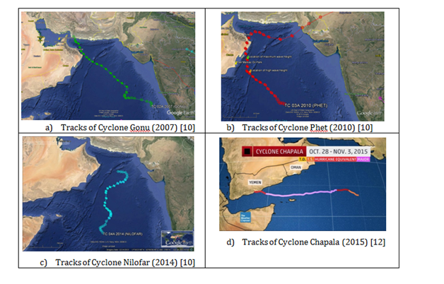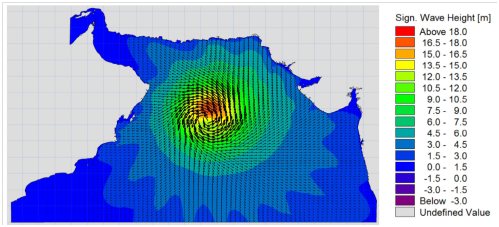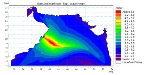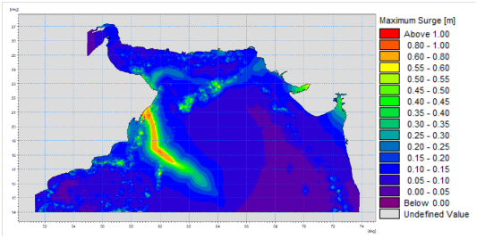 The cyclone model was validated using observed data. The methodology, model setup, model validation, model results and findings from the numerical modelling of various cyclones are presented in.7‒16 Typical model results of cyclonic waves are illustrated in Figure 4-6. Cyclone Phet (2010) generated a maximum significant wave height of about 13 m in the Arabian Sea and about 4 m in the Gulf of Oman7 whereas Cyclone Gonu (2007) generated maximum significant wave height of about 15 m in the Arabian Sea and about 9 m in the Gulf of Oman. The maximum significant wave height of 12.8 m during Cyclone Nilofar (2014) was found in the centre of the Arabian Sea and in contrast to Cyclones Gonu and Phet the height of waves reaching the Omani coast was limited.16 A maximum significant wave height of 19.2 m was found during Cyclone Chapala (2015) in the middle of the Arabian Sea and that the height of waves reaching the Omani coast was also limited. It is noted that neither Nilofar nor Chapala approached close to the Omani coast (Figure 2). Typical model results of cyclonic surges are illustrated in Figure 7 & Figure 8. The highest surge of approximately 1.0 m was found at the northern part of the Masirah Island during Cyclone Phet.7 Cyclone Gonu (2007) generated maximum surge of approximately 1.0 m in the middle of the Arabian Sea and of approximately 0.5m at Muscat. The maximum surge of approximately 0.8 m was found during Cyclone Nilofar (2014).16 During Cyclone Chapala (2015), the highest surge of 0.74 m occurred close to the cyclone track. Surge in the Gulf of Aden was 0.70m during this cyclone. Cyclone Chapala generated about 0.60m negative surge in the Gulf of Aden.