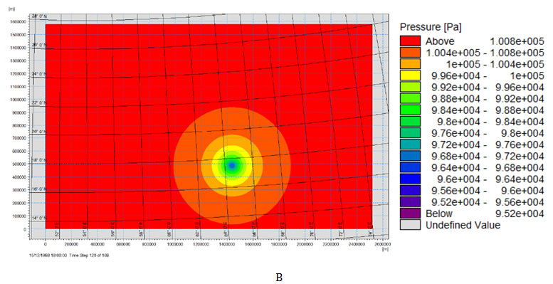 Royal HaskoningDHV has developed a Regional Cyclone Model for the Arabian Sea using the MIKE21/3 software. The cyclone model can be used to simulate both waves and surges for cyclones passing through the Arabian Sea. The MIKE21 Spectral Wave (SW) Model was used to simulate the cyclone waves.8 The fully spectral formulation of the SW model is based on the wave action conservation equation, where the directional-frequency wave action spectrum is the dependent variable. The MIKE21/3 Flow Model FM was used to simulate the cyclone surge.9 The model is based on the numerical solution of the two/three-dimensional incompressible Reynolds averaged Navier-Stokes equations invoking the assumptions of Boussinesq and of hydrostatic pressure. Thus, the model consists of continuity, momentum, temperature, salinity and density equations. In a recent study for a site in southern Oman, a total of 30 major cyclones were initially identified to have crossed the Arabian Sea since 1945 and affected the Omani coastline. A total of 13 cyclones were selected from this pool of 30 cyclones for the study based on a combination of severity (wind speed and, central pressure and diameter) and the proximity to site i.e. severe events were selected regardless of distance from the site while less severe events were only selected if they made land fall within 300km of site. Tracks and pressure fields of the selected cyclones were obtained from the Joint Typhoon Warning Center (JTWC), USA.10 Tracks of some major cyclones in the Arabian Sea are shown in Figure 2. The MIKE21 Toolbox11 was used to derive wind and pressure fields from the cyclone tracks and central pressures. The tool allows users to compute wind and pressure data due to tropical cyclone (hurricane or typhoon). Several cyclone parametric models are included in the tool such as Young and Sobey model (1981), Holland – single vortex model (1981), Holland – double vortex model (1980) and Rankine vortex model11 All the six input parameters required by the Young and Sobey model (i.e. time, track, radius to maximum wind speed, maximum wind speed, central pressure and neutral pressure) were available for the study and this was, therefore, used to generate the cyclonic wind and pressure fields. The other models require some additional parameters (such as Holland parameter B and Rankine parameter X) that need to be calculated using empirical relationships which add further uncertainty to the generated wind and pressure fields and were, therefore, not used for the study.Figure 3 shows an example of wind and pressure fields. These wind and pressure fields were used to drive the cyclone wave and surge models described later.