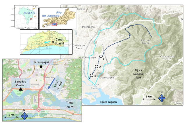 Figure 1 Boundary lines of the Canal do Anil microbasin, Rio de Janeiro and collection points (1, 2 and 3) of the water samples and the location of the pluviometric stations of Jacarepaguá (▲) and meteorological center of Barra Rio Center (★) in the region close to the Canal do Anil, Rio de Janeiro.
