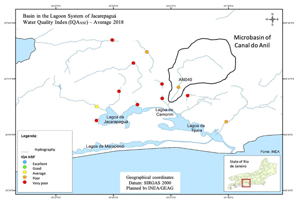 The State Institute of the Environment (INEA, 2019), of Rio de Janeiro, provides data observed during campaigns for the collection of samples of water from the Lagoon System of Jacarepaguá, carried out in the period 2012-2018, for the determination of the water quality index (IQANSF). Figure 2 shows the average values of IQANSF for 2018 in the sampling stations of the Lagoon System of the Jacarepaguá basin, with prominence being given to sampling station AN040 of the Canal do Anil basin.