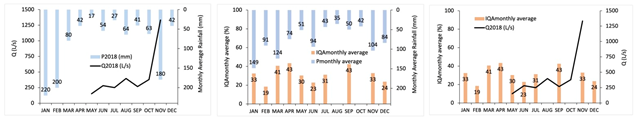 Figure 3 Relation between the pluviometric rainfall of 2018 (P2018), monthly average (Pmonthly average), estimated flow of 2018 (Q2018) and water quality index (IQANSF) in the Canal do Anil.