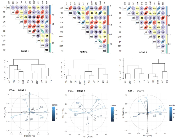 Figure 5 shows the percentage in a matrix of Pearson´s correlation coefficient, a representation of a dendrogram and an analysis of the principal components of the parameters analyzed for each sample of the Canal do Anil, such as Point 1 upstream, 2 intermediate position and 3 downstrream. The closest values to 100 indicate a strong correlation between the variables which might be positive or negative. Generally speaking, the variables lose their correlation as the volumes progress from upstream to downstream in the stretch of the canal. The dendrograms of Pearson´s correlation are formed in 2 main clusters in all 3 points. The following parameters - cadmium (CD), total dissolved solids (SDT) and electric conductivity (CE), form a common group in all the points. Another common group that was formed had the following parameters - pH, turbidity (TU) and copper (CO). Moreover, the values of r indicate a low correlation between the 2 clusters.