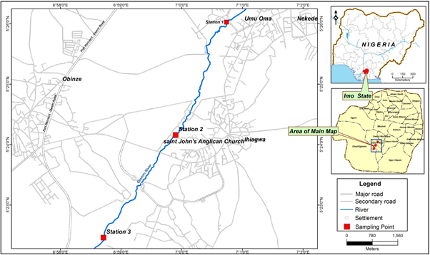 The study was carried out at the upper course of Otamiri River. Otamiri River is located within the tropical rainforest belt of Nigeria and lies between latitude 05o 23'N to 05o 30'N, and longitude 6o 58' E to 7o 04' E (Figure 1). The area is low lying being generally about 300m above sea level. The river runs from Egbu, where it has its major recharge resource and cuts through Nekede, Ihiagwa, Eziobodo, Olokwumuisi, Mgbirichi, Umuagwo and finally to Ozuzuin Etche town of river state of Nigeria, where it finally joins to the Atlantic ocean.6 The region experiences a mean annual temperature of 27oC and an annual rainfall of 200-300mm, with most of the months (April to November) characterized with high rainfall. The river serves the aforementioned transverse communities as main sources of water for Industrial, Agricultural, and Domestic use.