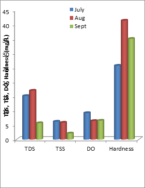 The results of the physico-chemical parameters of the Otamiri River in Owerri West LGA of Imo State, southeastern Nigeria between the periods of July 2019 to September 2019 is shown that all the parameters measured fall within the NESREA10 recommended limit for aquatic management except the pH, ammonia, total suspended solid, Nitrate and carbon (iv) oxides (Table 1), while Conductivity and carbon (iv) oxides were revealed to be significantly different across the sampling stations (Table 2). This finding corroborate the earlier report of Ogueri et al.4 and Adebayo et al.11 where the authors attributed the increased levels of those parameters to the erosional run-off of the adjourning lands due to the clearing of the riparian forest, and the sand dredging. Furthermore, the recorded fluctuation in the physico-chemical parameters (Figure 2‒5) could be attributed to the weather changes during the study period.