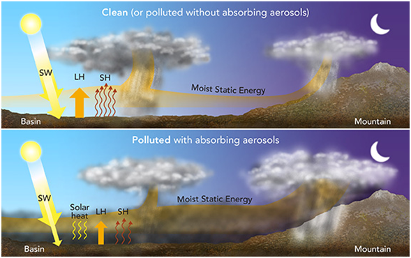 Figure 2 Aerosol-enhanced conditional instability increasing rainfall levels in Sichuan. Acronyms: MSE (moist static energy), SW (shortwave radiation), SH (surface sensible heat flux), and LH (surface latent heat flux).9