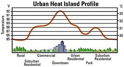 Urban areas are often warmer than rural areas (Figure 3) this phenomenon is known as the ‘urban heat island’ effect. On average, urban areas are 1-2 degree Celsius warmer than neighboring rural areas due to anthropogenic activities.10 Tall buildings trap more heat in between them. Urban canyons, which is the narrow arrangement of buildings along streets, inhibits reflected radiation from escaping into space, reducing the sky view factor, which enhances the urban heat island effect. Also, concrete has a low albedo between 10-35%, and this escalates surface temperature in cities.10 As temperature increases, air becomes unstable, causing it to rise up the atmosphere. Air cools as it rises, allowing water vapor within it to condense and form cumulonimbus clouds at the dew point, where latent heat is released. If air particles carry adequate water vapor, the clouds would transform into rain clouds, making cities more prone to thunderstorms, thus increasing the vulnerability of flooding in urban areas. In Northern Taiwan heat from anthropogenic activities influences precipitation formation, where climate modeling shows precipitation to be stronger on urban areas compared to non-urban areas.11 In another study by Yang et al.,12 it was observed that there was a relationship between urban heat island intensity (UHII) and short duration intense rainfall (SDIR) in Beijing. The study found that SDIR occurred more frequently in urban areas compared to rural areas and mostly in the summer, it also showed that UHII was at its highest before the start of SDIR event.