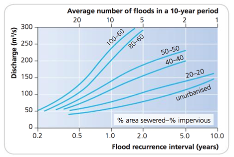 Economic growth and development have contributed to the increase in intraregional migration from rural to urban areas. 200 years ago, only 2% of the world’s population lived in urban areas but recently, this percentage has risen to nearly 50%.13 As a result of rising urbanization, natural soil from the ground is replaced by impermeable surfaces, such as concrete, to create a foundation suitable for the development of new buildings and roads.14 As a consequence of this, infiltration rates would fall due to the lack of permeable rocks and vegetation which aids both percolation and absorption of incoming rainwater; surface runoff of rainwater in urban areas will rise, lowering the groundwater table. Increase in surface runoff also results in a smaller proportion of rainwater contributing to baseflow, evapotranspiration and groundwater recharge. Urbanization results in a steeper rising limb and recession limb in a flood hydrograph as seen in Figure 4. Lag time also decreases, thus increasing flood frequency. Based on Figure 5 below, the river’s discharge and flood disasters occurrence increases as urbanisation takes place; in an ‘unurbanised’ area (for example, a rural area), flooding tends to occur every 0.5 to 10 years. However, in an area which has faced urbanisation, flooding is more likely to happen every 0.2 to 1.8 years with a larger impact, thus implying that the occurrence and magnitude of flooding in an urbanised area is greater. Modelling techniques have help in demonstrating the impact of urban surfaces on rainfall flows, for example Guan et al.,15 used the Stormwater Management Model (SWMM) to find out how hydrological processes change in an urban area in southern Finland. The findings showed that flow rates increase with an increase in impervious surfaces, and areas contributing to runoff increased which resulted in volume of runoff to double. In a similar study in Jakarta, Indonesia Remondi et al.,16 discovered that uncontrolled urbanization resulted in rise in flood events.