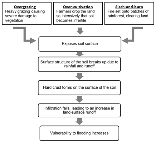 Over-cultivation, over-grazing and the slash-and-burn technique have triggered flooding.25 Over-cultivation involves a piece of land used for farming for a long period of time, causing soils to become so infertile till the point where no vegetation can grow on it. Over-grazing occurs when too many animals on land is grazed, causing pasture to be eaten away quickly due to inadequate recovery periods (Figure 5). This reduction of vegetation cover decreases infiltration rates. The slash-and-burn technique is a process where fire is set onto a patch of rainforest, clearing the area to make way for plantations. Initially, the ash aids soil fertility and the presence of weeds on the plot is relatively low. As time passes by, soil fertility falls and weeds grow, preventing the area from sustaining future vegetative growth.26 Figure 7 illustrates the relationship between overgrazing, over-cultivation, slash-and-burn technique and flooding. Furthermore, changes in agricultural practices have led to more deeply compacted soils, lines left from ploughing and cracks in soils.27 Factors, such as soil compaction, caused by the usage of heavy machinery, reduces its porosity, inhibiting the soil from storing more water which then reduces antecedent moisture. This in turn increases surface runoff of a greater volume of water, increasing the risk of flooding. Besides that, clearing a patch of rainforest to make space for new crops to be cultivated causes the exposed topsoil to be eroded by wind or rain – Brazil has been shown to aggravate flooding due to soy production.28 This has not only caused land degradation but has led to the increase in debris and sedimentation flow, contributing to floods Figure 8.29
