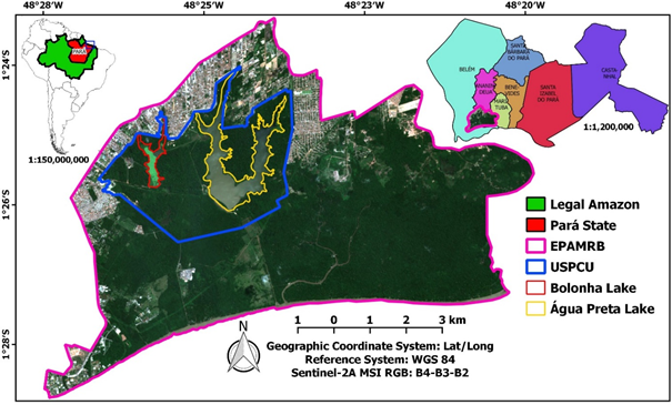 Figure 1 Map of the study area showing the geographic location of the Environmental Protection Area of the Metropolitan Region of Belém (EPAMRB), Utinga State Park Conservation Unit (USPCU) and both Bolonha and Água Preta Lakes. The coloured municipalities of the Metropolitan Region of Belém are supplied by the water of both lakes.