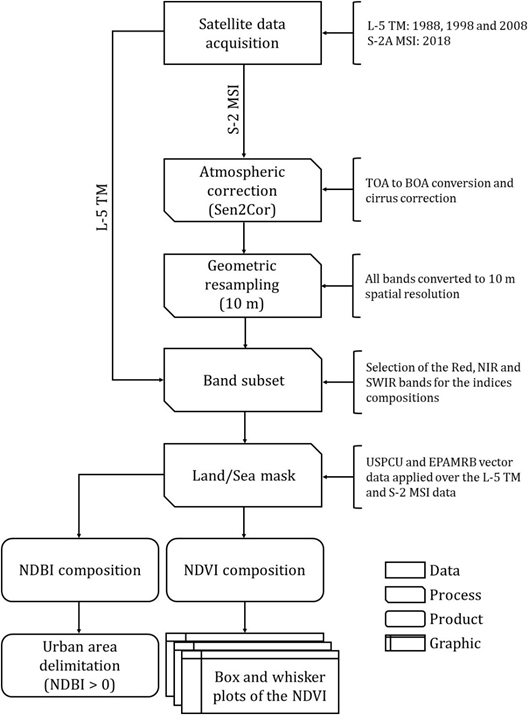 Some of the existing technological alternatives to monitor earth’s natural areas are the Remote Sensing (RS) data and techniques.19,20 Among the RS possibilities applications for ecological and urban purposes, the Land Use and Land Cover (LULC) change mapping21 and the execution of radiometric indices to monitor vegetation health area are some of the most common possibilities.22 In the last few decades, open access RS data had made the number of its applications increase.23 For instance, some Amazon level works had been done in order to understand both its LULC24 and the forest resilience throughout vegetation indices.25 It is essential that methods and data quality for each study area are selected with transparency and according to the specificities of each region.26