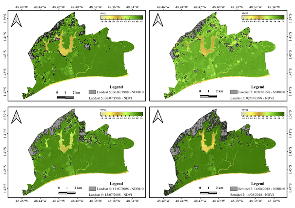 From the NDBI results, we select the values greater than 0, which should describe urban occupation, as they are supposed to exclude both the chlorophyll and the water spectral responses.43,44 However, the amount of sediment in the Amazon waters can make it mistakenly respond as constructed areas.45 For example, in the study of Trindade46 the waters around Santarém city were confused with the built-up areas of the town. For this reason, after we found the values of NDBI greater than 0, we manually corrected the results to represent the urban area at our study site.