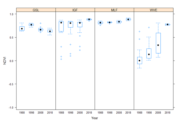 Figure 4 Box and whisker plots of the NDVI showing values for each (n = 20) vegetation class in 30 years (1988-2018). The WVE’s NDVI values increased significantly in the period, pointing the worrisome consequence of pollution of the Bolonha Lake.