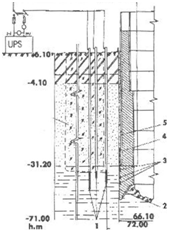 Figure 3 Instruments location plan on the deep- set well: 1,2, Pressure and friction sensors; 3, Reinforcement dynamometer; 4, Wiring cables; 5, Control station.
