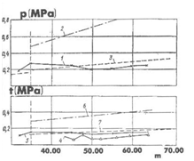 Figure 4 Pressure and friction measurements during the deeping process, 1,4,5, Experimental data; 3,6,7, Computering values for ground pressure and friction.