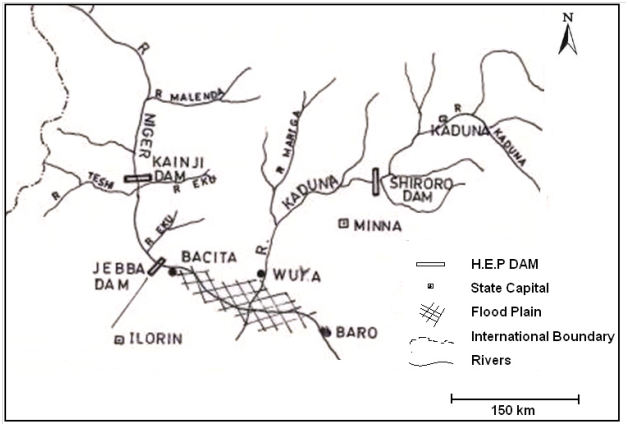 The average rainfall at the headwaters of Niandan and Milo rivers at the source of the Niger at the Fouta Djallon Mountains in Guinea and its exit to the sea in Nigeria is 2200mm. The river flow regime is characterized by two distinct flood periods occurring annually namely the White and Black floods. The black flood derives its flow from the tributaries of the Niger outside Nigeria (flow lag October to May) and arrives at Kainji reservoir (Nigeria) in November and lasts until March at Jebba after attaining a peak rate of about 2,000m3/sec in February.17 The White flood is a consequent of flows from local tributaries especially the Sokoto-Rima and Malendo river systems. The White flood is heavily laden with silts and other suspended particles (flow lag June to September) and arrives Kainji in August in the pre-Kainji Dam River Niger having attained a peak rate of 4,000 to 6,000m3/sec in September-October in Jebba. The critical low flow period into the Kainji reservoir is March and July each year (Figure 1).
