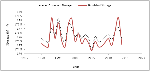 The V-S procedure was employed to develop S-R-Y relationships, it is based on the premise that a reservoir system fed by AR(1) lognormal inflows, the standardized storage capacity C for a failure free operation is a random variable. The developed S-R-Y model was used to simulate the reservoir storages. Figure 2 depicts the observed and simulated storages. The developed models’ extent of correlation was also tested with a value of 0.72 imperatively showing strong correlation between the observed storages and the simulated storages. It also shows that the model is strong (Table 2).18