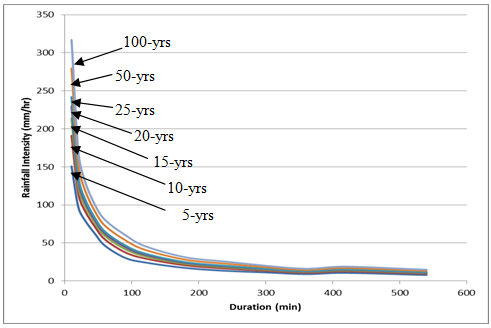 Table 1 contains Wisner’contains a,b and C(Equation 11) and the efficiency criteria for judging the accuracy of each equation. It is observed that the upper bound for constants “b” is generally less or equal to 5 except for 5-yr return period which has a constant value of 8. Figure 1 shows the IDF curves for return period of 5 to 100years. These plots portray the expected logarithmic profile typical of IDF curves. From Table 2, it is apparent that (R2) falls within the inequality 0.40 ≤ R2 < 0.972, which implies the strong explanatory power of IDF equations and they fall within the range for 5 ≤ T-yr ≤ 25. This return period range is usually recommended for the design of urban storm drainage systems. Also the R2 values obtained fall within the acceptable limit.24,25 Beyond return period of 25 years, the explanatory power of the IDF may be unsatisfactory. The result obtained for other indices, SEE, RMSE, RSR, MAE and NSE may be represented by the following inequalities ; 2.55≤SEE≤4.31; 2.34≤ RMSE≤ 3.96; 0.0441≤ RSR≤ 0.056; 1.93≤ MAE≤ 2.95 and 0.9969≤ NSE≤ 0.998 respectively. Based on these inequalities, the IDF equations are considered excellent according to NSE and RSR indices.24,25 The MAE, RMSE and SEE indies also showed better performances due to their lower values.