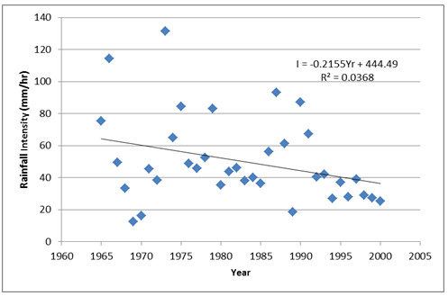 The traditional way of studying the impacts of climate change at catchment scale involves downscaling the outputs of global circulation models (GCMs) from which location specific impacts such as IDF, etc are derived.11 Currently, there is no standard or accepted methodology to derive IDF curves or equations for future climate conditions.12,13 In this study, the observed trends of precipitation and intensity and magnitude for the period 1965 to 2000 were used to extrapolate statistically current IDF curves to infer future climate. Goori Bi et al.,13 and Olsson et al.,14 used this method to extrapolate current IDF curves for Arzika, Sweden. Denault et al.,15 also used this method for Vancouver Canada, and Guo16 applied the same approach for Charlottenlund, Denmark, to predict extreme precipitation for the future. The main limitation of the approach is the assumption that current trends in rainfall intensity will remain the same in the future.12,15 The impact of future climate on urban discharges will be modeled using a probabilistic approach such as the rational formular method, SWMM hydrological model etc., that will convert the updated precipitation events into a design flood event.