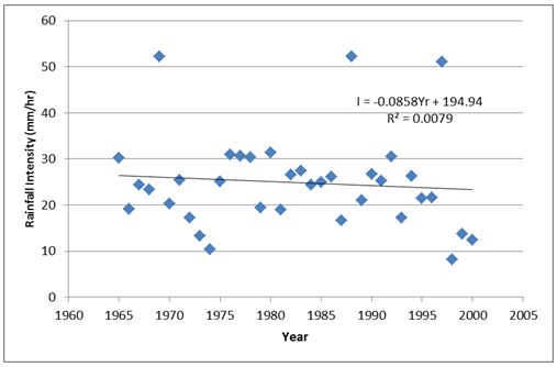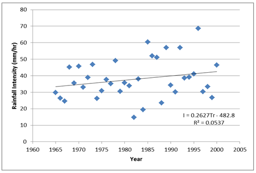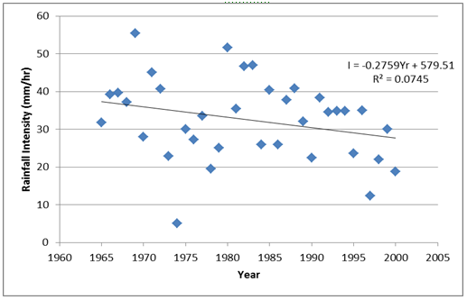 Table 2 shows the results of trend analyses using Mann-Kendall and Sen’s tests. The Mann-Kendall test and Sen’s Slope estimator were applied to the rainfall intensity annual time series. The observed Man-Kendall statistics (Zmk) and Sen’s Slope values (β) are presented in columns 3 and 9 respectively. These results indicate annual rainfall intensities characterized by negative (downward) trends for rainfall durations of 10 to 30 minutes, while between 45 and 540 minutes, they exhibit both negative (downward) and positive (upward) trends. Figure 2 presents the rainfall intensity plots for durations of 10 – 45 minute, The susequent plots are not presented due to lack of space. It is apparent that in column 9, all the durations indicated statistically insignificant trends at 5% significant level, except for 540 – minutes duration where a statistically significant positive trend was obtained. Extrapolation of future rainfall intensity scenarios could not be performed due to observed insignificant trends.15 Furthermore, the statistically insignificant trends obtained for rainfall durations of 10 to 30minutes also corresponds to the inlet time generally applied for computing storm water – flow rates.26 and this implies that the impact of climate change on storm water – flow rates is negligible and may not pose flooding risk.
