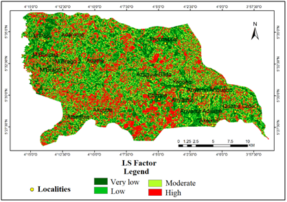 Topography of the site or LS factor: According to the calculation, the values obtained for the LS factor vary between 0 and 1202.304 (Figure 5). The highest values of the topographic factor represent an area of 5 182.2hectares of the study area about 11.83%. These values are distributed over the whole surface of the town; however they are more concentrated in the South. The moderate value is from 3 356.73 about 7.67% of the total area of the municipality and are located throughout the study area. 36.41% of the values are small with an area of 15 943; 59hectares. The lowest values represent 19 306.17hectares or 44.09%. They are located on the plains. Low and very low values are distributed over the whole surface of the town of Anyama.