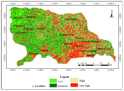Spatial distribution map of the C factor of 2015 (Figure 6) shows the sensitivity of different types of Land use to erosive process. The lowest coefficient is located mostly in the north and is withholding water. The moderately vegetated areas and weakly eroded are located in the northwest, southwest and center. The moderately eroded areas are located in the South East, the North and the Center. The highest coefficient is located in the South and dispersed in the northwest. The results show that 1625.51hectares or 40.38% of the area of the town of Anyama has a plant cover rate high with a moderate sensitivity to water erosion and 22131.54hectares or 50.71% are crops/fallow. Crop/fallow area are the localities that are considered highly susceptible to water erosion. 3815.73hectares, which corresponds to 8.74%, are occupied by bare soil and 72.54hectares or 0.17% is occupied by water. Bare floors match the type of the most vulnerable Land cover to erosion. As for water, it concerns the least attacked by water erosion.